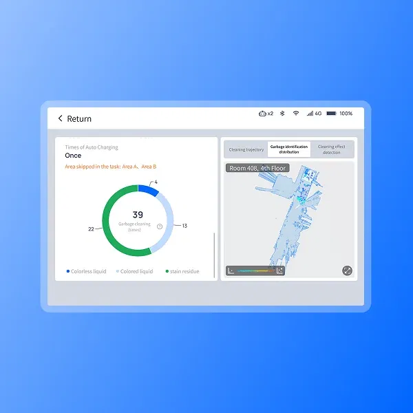 Door AI-visieherkenning te combineren met dynamische routeplanning, detecteert het systeem in realtime veelvoorkomende natte vlekken – zoals koffievlekken, sauzen en plassen – tijdens inspecties en genereert het direct optimale schoonmaakroutes. Met een reinigingssnelheid van 1.500–3.000 m²/u biedt het snellere respons en efficiëntere dekking.